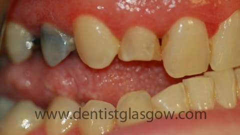 Some of the old amalgam fillings which had tarnished black were removed and replaced with white fillings made from a composite bonding resin. The front teeth were prepared for either porcelain veneers or crowns.